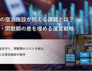 ハイシーズンの好調を、通年の安定収益につなげられていますか? 海や山、温泉地、スキーリゾート——観光地の宿泊施設には独自の魅力がある一方、多くの経営者が「繁忙期と閑散期の激しい需要差」に悩まされています。 ゴールデンウィークや夏休みはフル稼働でスタッフが手不足、オフシーズンは稼働率が激減して固定費が重くのしかかる。この繰り返しを、仕組みで解決できている施設はまだ多くありません。 本記事では、季節変動の課題を整理したうえで、通年安定経営を実現するための戦略とシステム活用法を解説します。 通年で選ばれる宿泊施設の条件とは? 観光地の宿泊施設が繁忙期だけでなく通年で選ばれるためには、立地や景観だけでなく、季節ごとの需要変動に対応できる運営体制が欠かせません。人手不足の時期でも安定した受け入れができること、閑散期にも価格やプランを柔軟に調整できること、そして宿泊者にとって予約からチェックインまでがスムーズであることが重要です。さらに、多言語対応や非対面対応など、幅広い宿泊ニーズに応えられる仕組みを整えることで、年間を通して選ばれやすい施設運営につながります。 観光地の宿泊施設が抱える3つの課題 課題① 繁忙期の人手不足と閑散期の人件費ロス 繁忙期に合わせてスタッフを増員すると、閑散期には人件費だけがかさむ。観光地では都市部に比べて求人自体も難しく、この構造的なジレンマに頭を悩ませている施設は少なくありません。 時期 稼働率の目安 主な課題 繁忙期 80〜100% スタッフ不足・クレーム増加 平常期 40〜60% シフト調整が難しい 閑散期 10〜30% 固定費が重くのしかかる 課題② インバウンド対応の壁 コロナ禍以降、外国人観光客は急増し、富士山周辺・京都・沖縄・北海道などでは外国人宿泊者が過半となる施設もあります。 一方で、多くの宿泊施設は英語・中国語・韓国語などの多言語対応が不十分で、チェックインや滞在中対応に時間を要し、クレーム増加につながっています。 課題③ 感覚頼りの価格設定による機会損失 「例年通りの料金でいいだろう」という感覚頼りの価格設定では、繁忙期の需要を十分に取り込めず、閑散期には安易な値下げに陥りやすくなります。さらにOTA依存が高い施設では、手数料負担によって利益が圧迫され、繁閑差を埋めるための収益改善が進みにくい場合もあります。 繁忙期・閑散期の差を埋める「3つの戦略」 戦略① 省人化・無人化で固定費を最小化する フロント業務の自動化は、繁忙期の人手不足と閑散期の人件費ロスを同時に解消する最も有効な手段です。セルフチェックインシステムを導入することで、以下の業務をシステムが自動処理します。 本人確認・宿泊台帳の作成 パスポートスキャンによる外国人対応 スマートロック連携による鍵の受け渡し 事前チェックイン・顔認証 クレジットカード・コンビニ払いによる決済 MujInnの実績では、チェックイン対応の人件費を最大50%以上削減した事例も報告されています。 戦略② ダイナミックプライシングと直販強化で収益を最大化する 需要が高まる時期は料金を引き上げ、閑散期は割引プランで稼働率を維持する。この柔軟な価格設定と、OTA手数料を削減するためのダイレクト予約の仕組みを整えることが、収益の底上げにつながります。 MujInnのPMSでは、サイトコントローラー(ねっぱん!・手間いらず)との連携で複数OTAの予約を一元管理しながら、ダイレクト予約の受け付けも可能です。 戦略③ オフシーズンの需要を掘り起こす 「観光地だからオフシーズンは仕方ない」は過去の話。閑散期にも需要を創り出すことは十分可能です。 ワーケーションプラン:自然環境を活かした長期滞在向けプラン 体験型セットプラン:スキー・トレッキング・温泉療養との組み合わせ 合宿・研修の誘致:団体需要で稼働率を安定化 インバウンド向け企画:オフシーズンの静かな日本を好む外国人層へのアプローチ MujInnで実現する「通年安定運営」の仕組み MujInn(スマートフロント ムジン)は、観光地の宿泊施設が抱える課題に対応する機能を一つのシステムに集約しています。 MujInnで実現できること グランピング・リゾート施設の運営をDX化する上で、MujInnが提供する機能を整理します。 ① セルフチェックインで完全非対面・無人対応を実現 タブレット端末またはスマートフォンから、本人確認・身分証撮影・決済まで一連の手続きを完了できます。 旅館業法等を踏まえた本人確認フローを採用しているため、法令遵守と非対面運用を両立。受付業務の負担を抑えながら、宿泊者にとってもスムーズなチェックイン体験を提供できます。 ② スマートロック連携で鍵管理を完全自動化 チェックイン完了と同時に暗証番号が自動発行・設定され、チェックアウト後は自動で無効化されます。鍵の受け渡しが不要になるため、スタッフの対応負担を軽減しながら、スムーズで安全な入室管理を実現できます。 ③ 一括メッセージ送信で台風