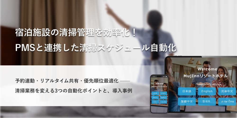 MujInn公式サイトによれば、セルフチェックインと連携した無人運営で、フロント対応時間を最大90%以上、管理費を50%以上削減した実績も。清掃管理の効率化は、ホテルDXの重要なピースです。
