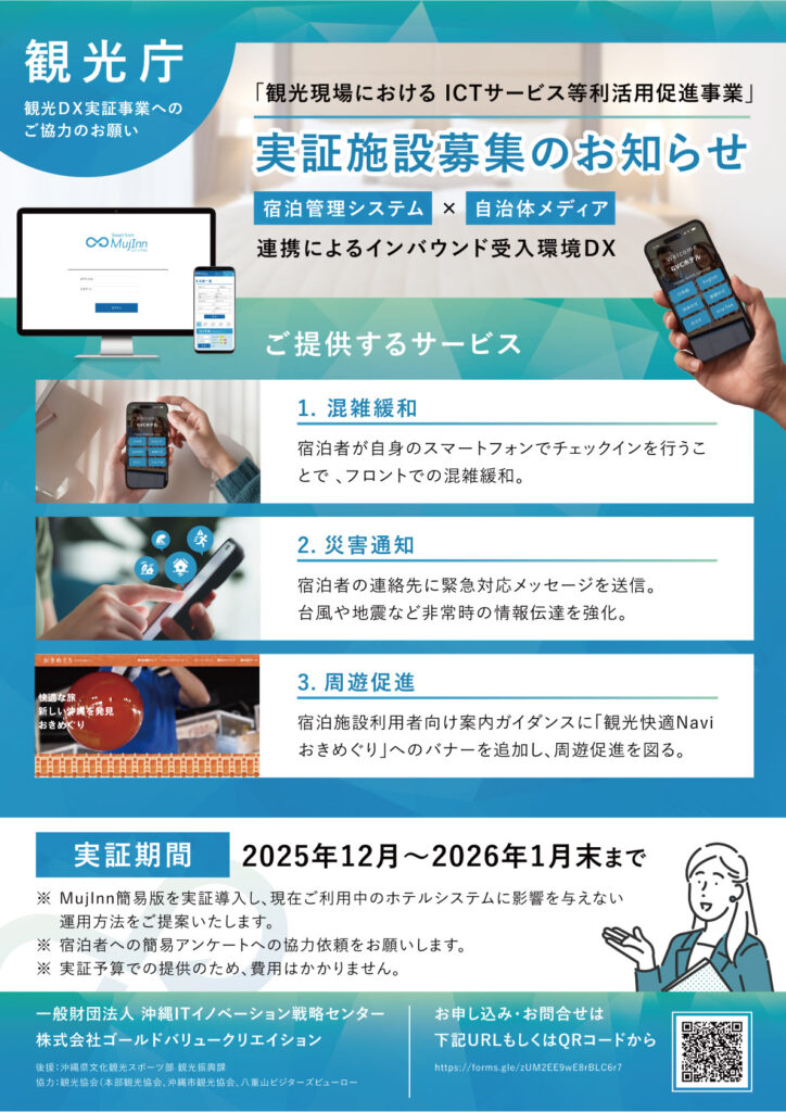 この度、観光庁「観光現場におけるICTサービス等利活用促進事業」において、地域の宿泊施設を対象とした実証事業の参画施設を募集しております。