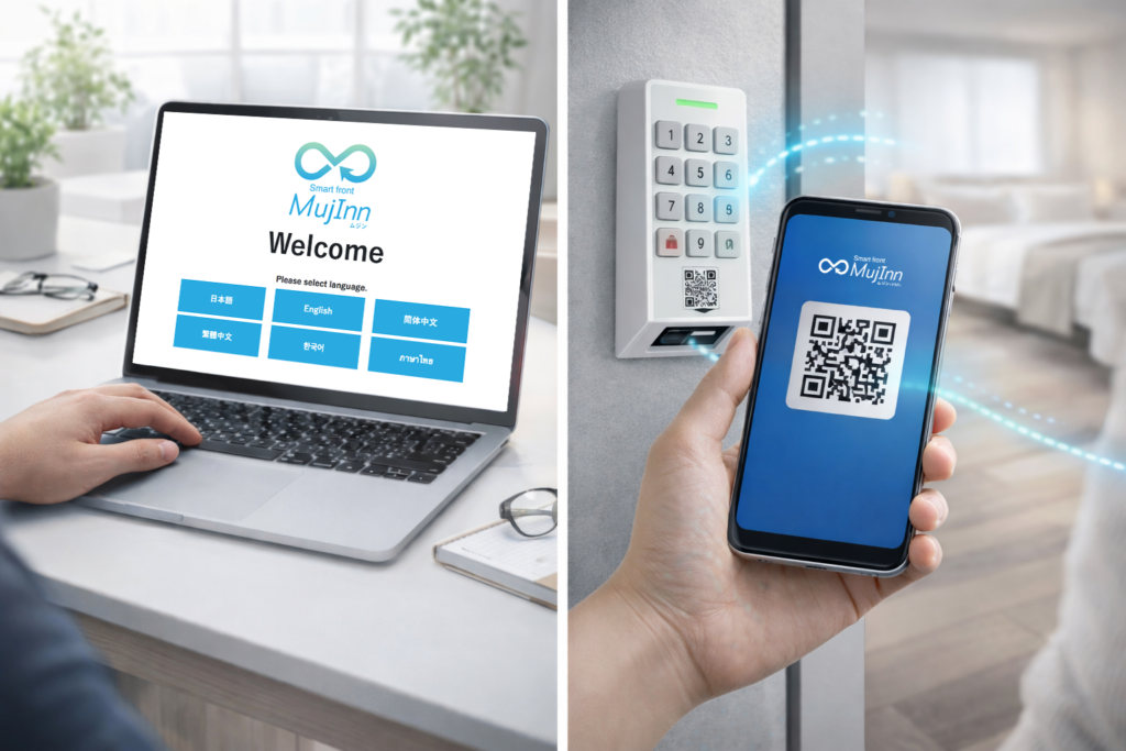 MujInn最新の「スマホチェックイン」機能と組み合わせることで、スマホでのチェックインからスマホ表示のQRコードで客室入室までの流れがシームレスになります。