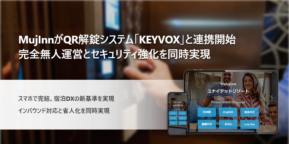 これまで「MujInn」は無人チェックイン、予約管理、ルームインジケーター、OTA連携など、宿泊運営に必要な機能をワンストップで提供してきました。そしてこのたび、より安全で効率的な施設運営を実現するために、QRコード解錠システム「KEYVOX(キーボックス)」との連携を開始しました。